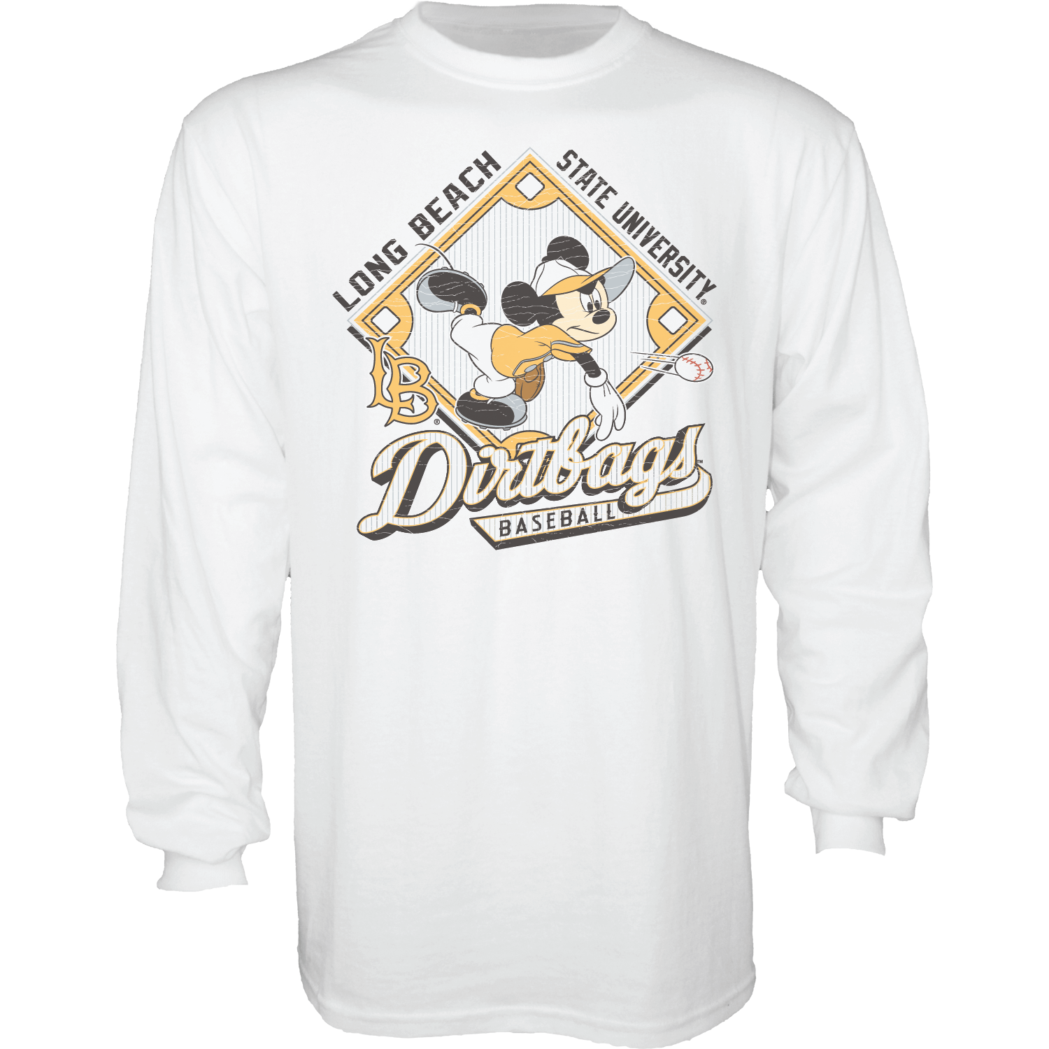 The Dirtbags LBSU Mickey L/S Tee is a soft white long‑sleeve t‑shirt made from comfortable, durable cotton that provides a relaxed fit perfect for game days or casual wear. Created by Blue 84 in collaboration with Disney, it features a retro‑style graphic of Mickey Mouse playing baseball with the LB logo and “Dirtbags Baseball” lettering, giving it a fun, nostalgic, and spirited Long Beach look.